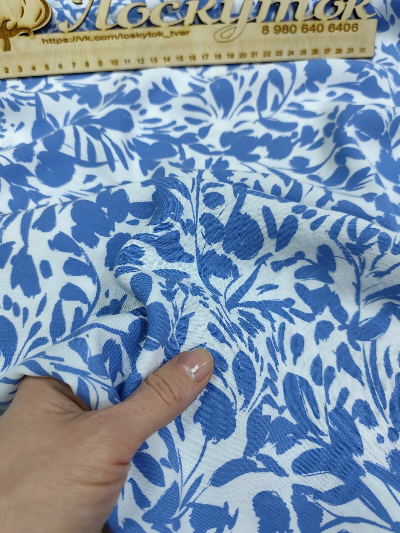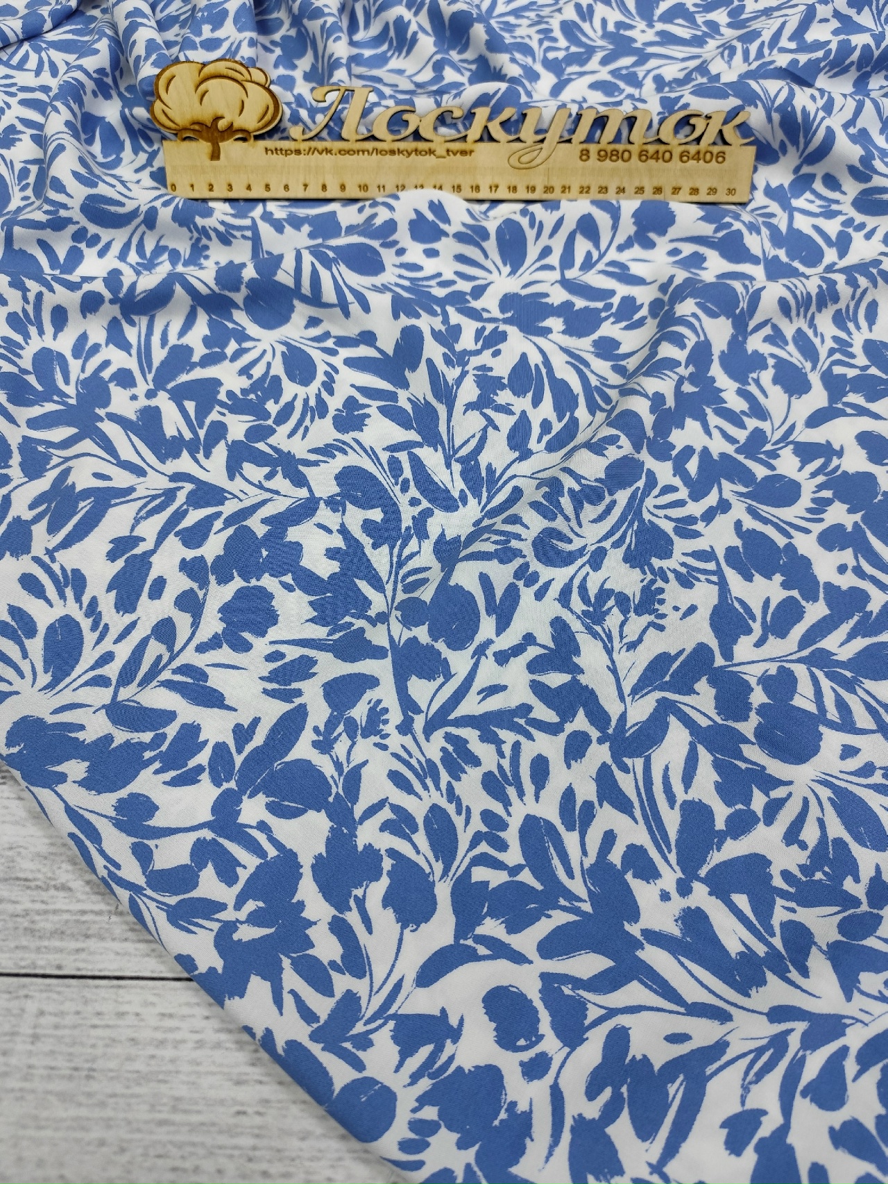Штапель / Цветы голубые на белом – купить за 390 ₽ | Лоскуток